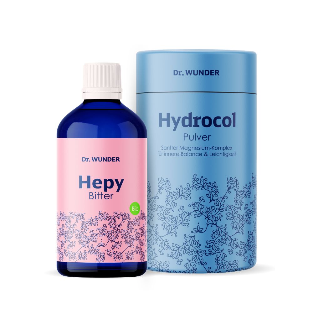 Die Bauchwohlkur ist eine effektive Kombination, die dein Bauchgefühl wieder ins Lot bringen kann. Hydrocol kann mit seinen speziellen Magnesiumverbindungen auf natürliche Weise die Darmfunktion fördern. Es ist einfach anwendbar und fügt sich nahtlos in deinen Alltag ein. Hepy Leber-Komplex, ein wohltuender Kräuterkomplex in Kapselform oder unser Hepy Bitter in Tropfenform, harmonisieren die Verdauung und können zudem helfen, den Appetit auf Süßes zu regulieren. Diese wohltuenden Kapseln sind flexibel einsetzbar und passen sich ideal deinem Tagesrhythmus an.