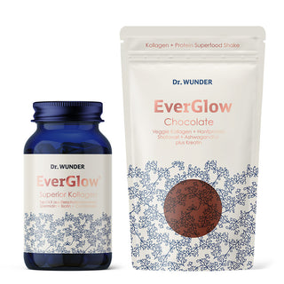 Das Herzstück bilden der EverGlow Superior-Kollagen-Komplex und der EverGlow Chocolate Shake. Gemeinsam schaffen sie eine Basis aus Struktur und Versorgung: Kollagen, Hyaluron, Spermidin und Mikronährstoffe für Spannkraft und Zellerneuerung – dazu pflanzliches Protein, Kreatin und Adaptogene, die Energie, Balance und Regeneration schenken. Ein Ritual, das nicht nach Pflicht schmeckt, sondern nach Alltag, der guttut.